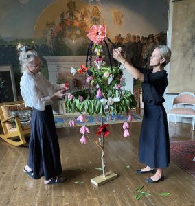 För första gången ger Pernilla och Sofia en workshop på plats i Carls ateljé – ett unikt tillfälle att vara kreativ i historisk miljö. Med konsten direkt närvarande skapar vi blomsterarrangemang i pappersblomsformat. Vi inspireras av Karins och Carls värld av skicklighet i lekfullhet och komposition. Med dig hem kommer du ha en bukett inspirerad av Karin, hennes väninnor och trädgården på Lilla Hyttnäs. Tillsammans skapar vi pelargonen, krasse och näckrosen. Pernilla och Sofia tolkar också Karins ikoniska blomstertrappa på ett nytt sätt och inspirerar till sommarfestens dukade bord.